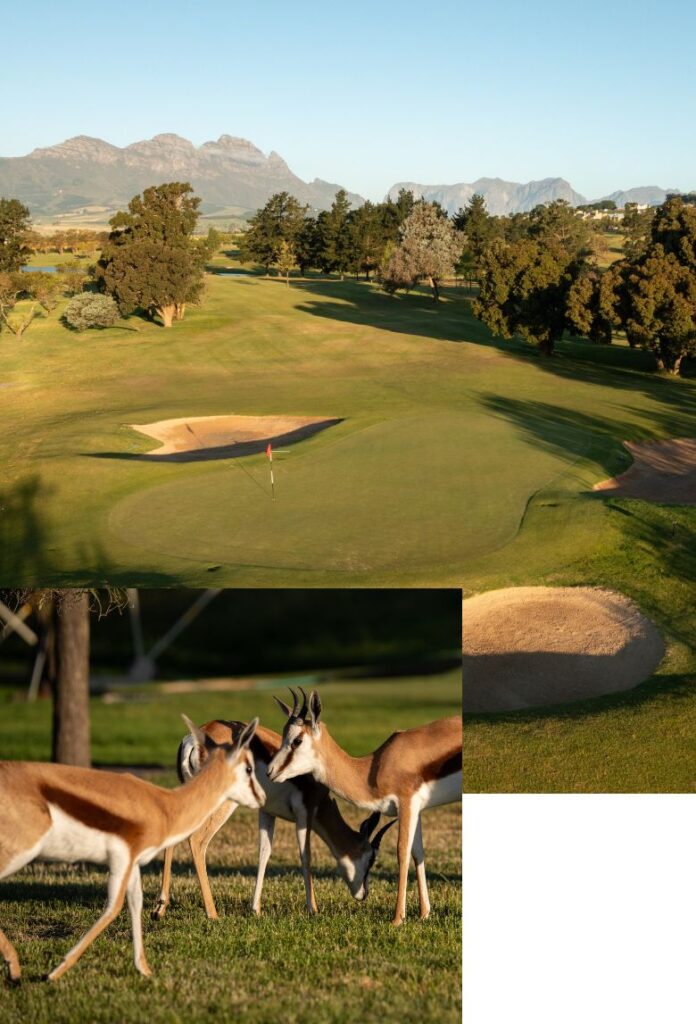 Dieser internationale Meisterschaftskurs liegt vor einer malerischen Bergkulisse und ist umgeben von sanft gewellten Weinbergen. Der Kurs ist anspruchsvoll. Wasser, riesige Fairway- und tiefe Greenbunker sind für alle Golfer eine Herausforderung. Spektakulär ist der Abschlag von einem Tee, das auf einer Insel gelegen ist. Wenn Sie beim „Golf in Südafrika“ mitreden wollen, so müssen Sie De Zalze unbedingt gespielt haben.